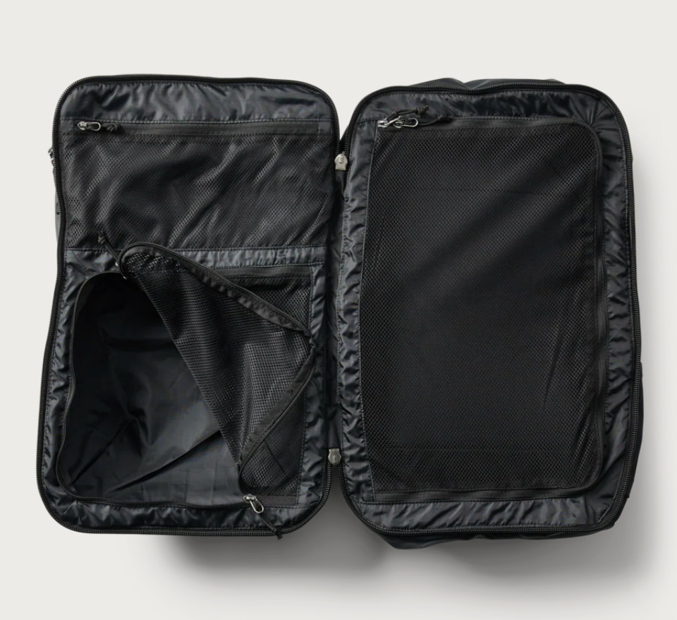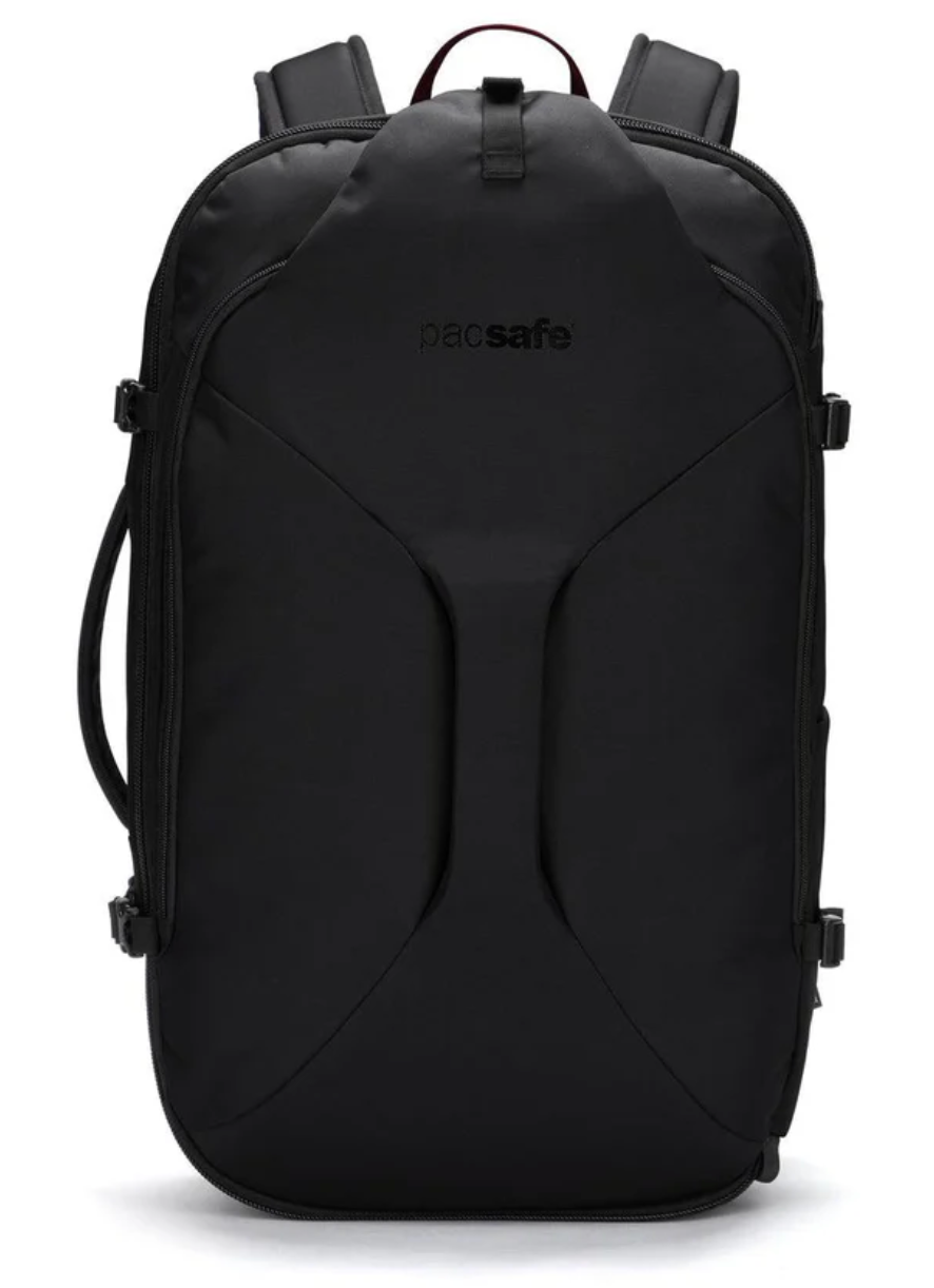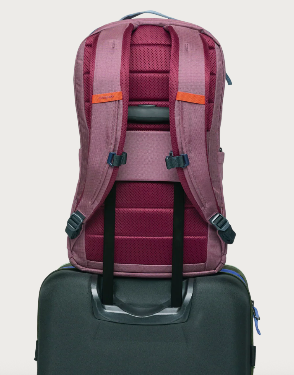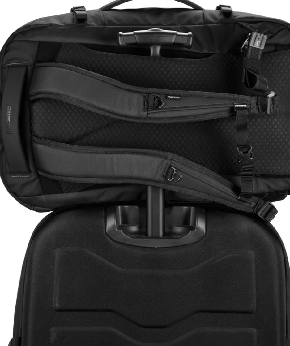 Carrying options include a leather top handle, ergonomic, adjustable shoulder straps, and an integrated rear strap that slides over the extension handle of a rolling suitcase for secure stacking.