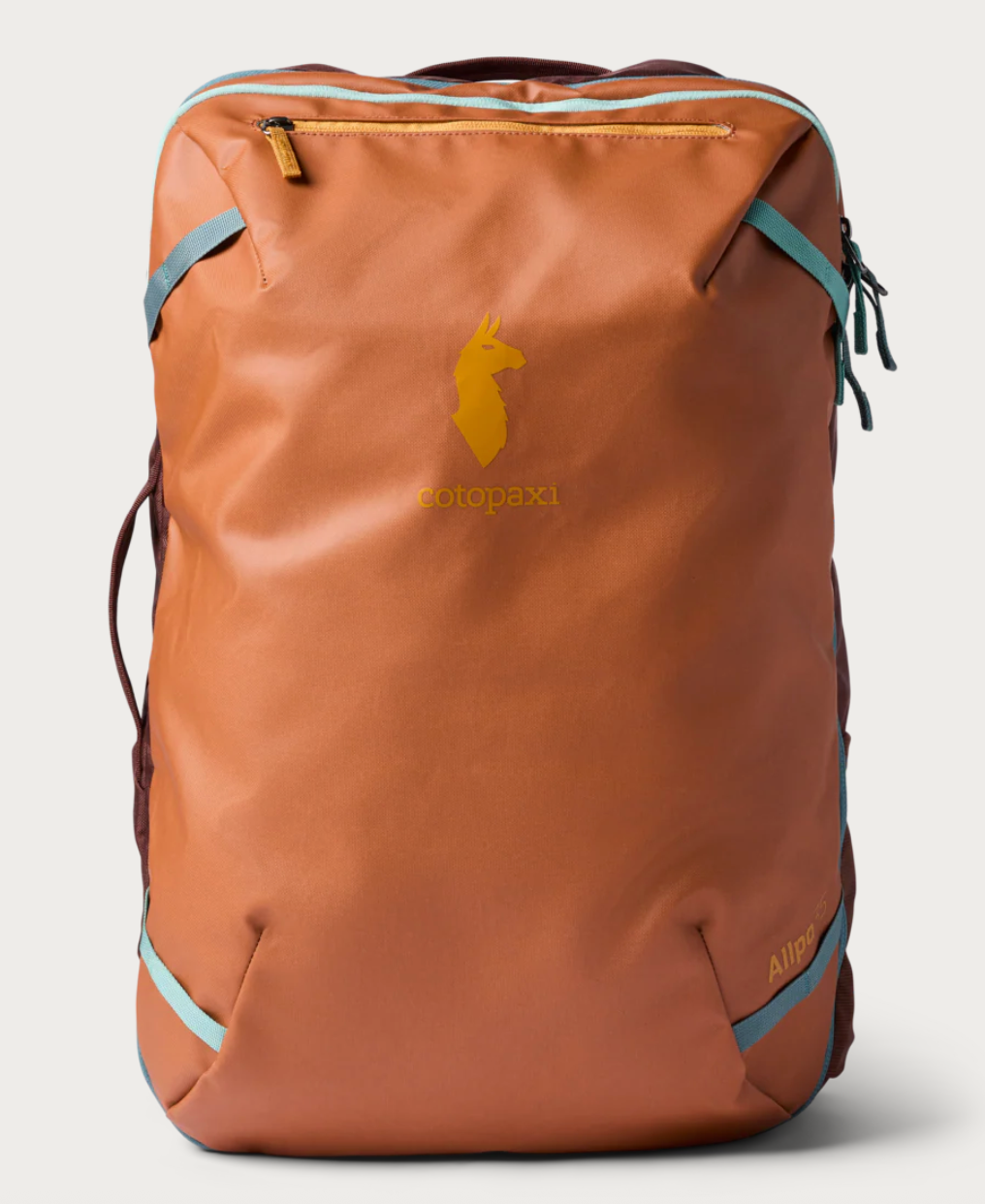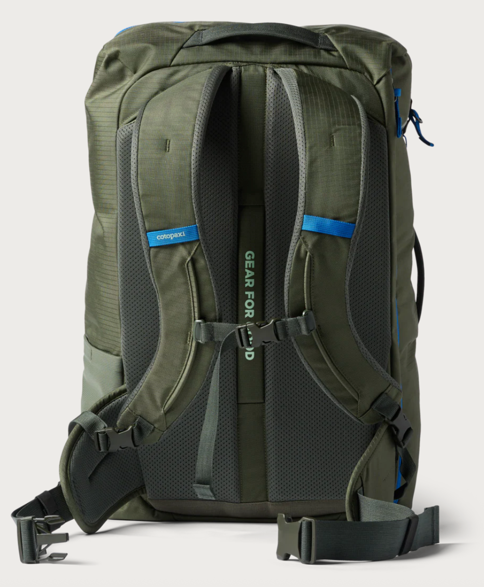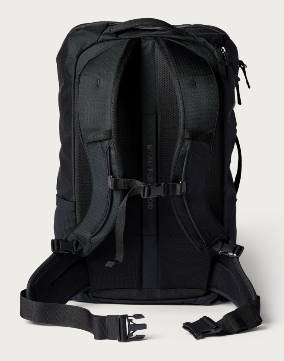 Carrying options include a leather top handle, ergonomic, adjustable shoulder straps, and an integrated rear strap that slides over the extension handle of a rolling suitcase for secure stacking.