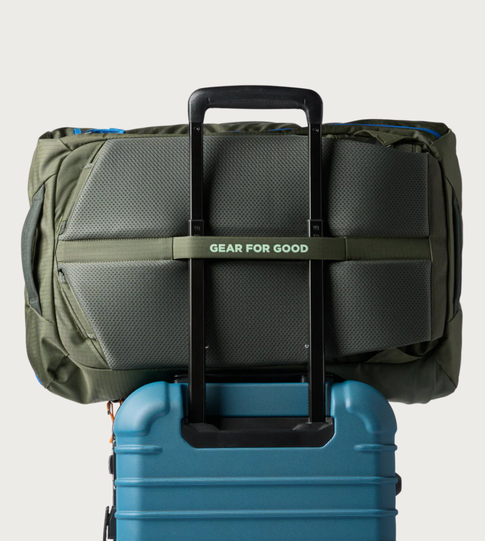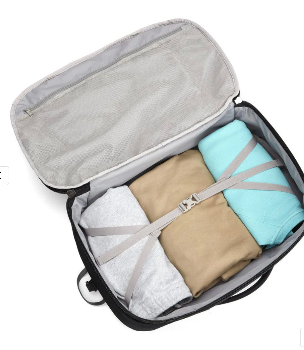 - Rear fabric strap fits around the extension handle of a Rollaboard or spinner suitcase for secure stacking and hands-free mobility