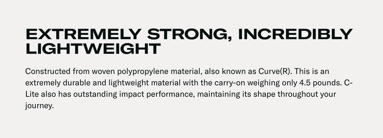 Staying true to the great stories that are intrinsically woven into the CURV® technology and our iconic design, we proudly introduce C-Lite. This top-notch and made in Europe collection now ensures an even smoother travel experience offering double wheels and an elongated double pull handle. Its incredible lightness and outstanding comfort will make your journey even more delightful.